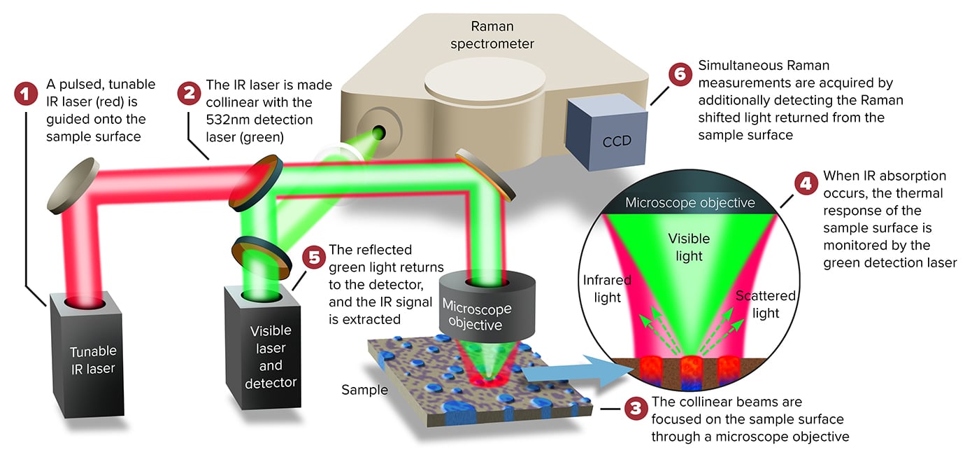 mIRage overcomes the limit of IR diffraction with an innovative technique, photothermal infrared optical spectroscopy (O-PTIR).