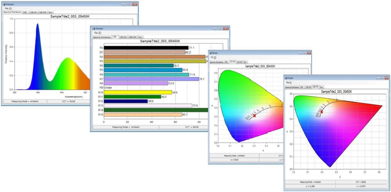 4. Mesure d’indice de rendu des couleurs IRC, d’éclairement spectrique, de longueur d’onde crête, de valeurs trichromatiques, de chromaticité, de température de couleur corrélée, de longueur d’onde dominante, de pureté d’excitation, d’éclairement et des écarts de valeurs.